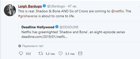 Твори Лі Бардуґо, американської фентезистки, яка надзвичайно вдало дебютувала у 2012, увійшовши в літературний світ романом "Тінь та кістка", відправляються на малі екрани стрімінґового сервісу Netflix. Мова йде про трилогію "Ґриша", в яку, власне, входить згадана вже книжка, а також дилогію "Кеттердам", дія якої відбувається в тому ж фентезійному світі.