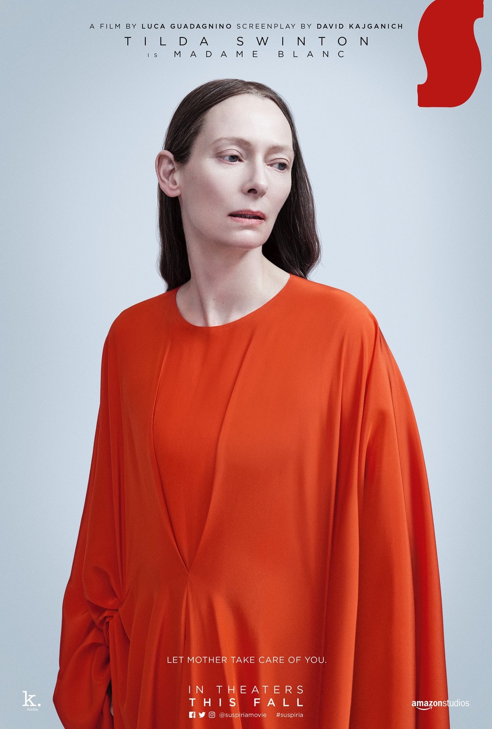 5. Чудова Тільда Свінтон на персонаж-постері ремейку "Суспірії" 1977 року. Американська балерина приїжджає до Берліна, щоб навчатися танцювальної майстерності у відомому балетному училищі. Поступово вона виявляє, що за його дверима відбувається щось зловісне та містичне. Дівчина може стати наступною жертвою, якщо не розгадає таємницю легендарної академії.